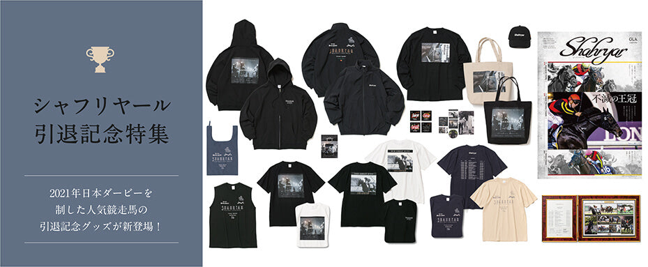 2021年の日本ダービー、2022年ドバイシーマクラシックなど国内外で活躍したシャフリヤールの引退記念グッズを数量限定販売。どうぞお見逃しなく! アパレル・ファッション小物 ・ブルゾン ・パーカー ・ロンT ・TシャツA ・TシャツB ・TシャツC ・ノースリーヴ ・キャップ ・トートバッグ ・マルシェバッグ インテリア雑貨 ・ポスター ・キーホルダー ・ステッカー ・ステッカー フォトパネル ・写真パネル