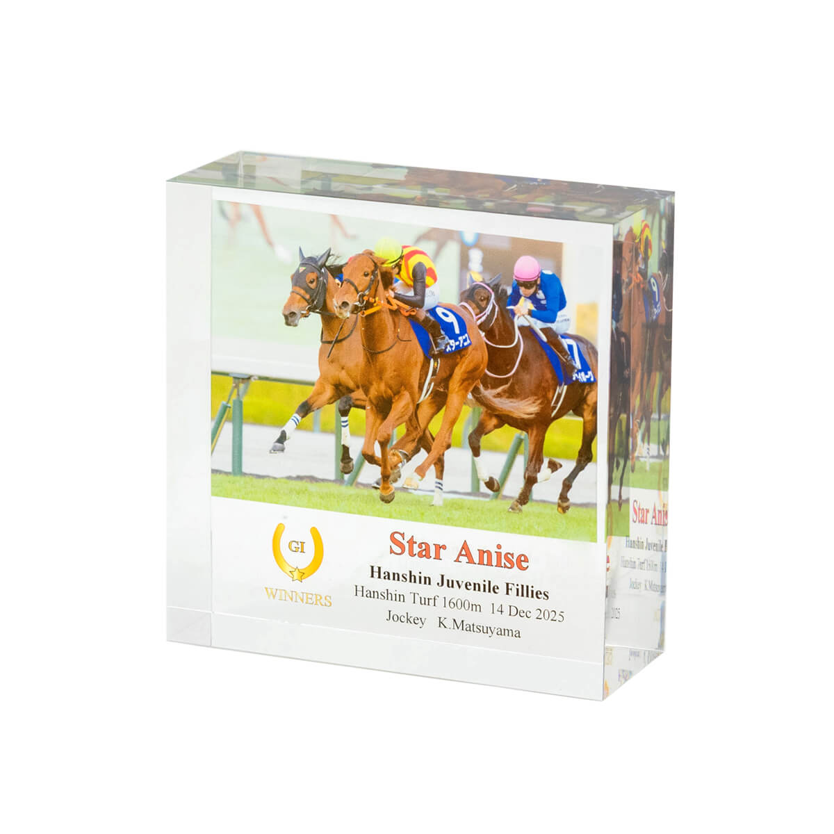2025年阪神ジュベナイルフィリーズ優勝馬スターアニスのアクリルオブジェ。