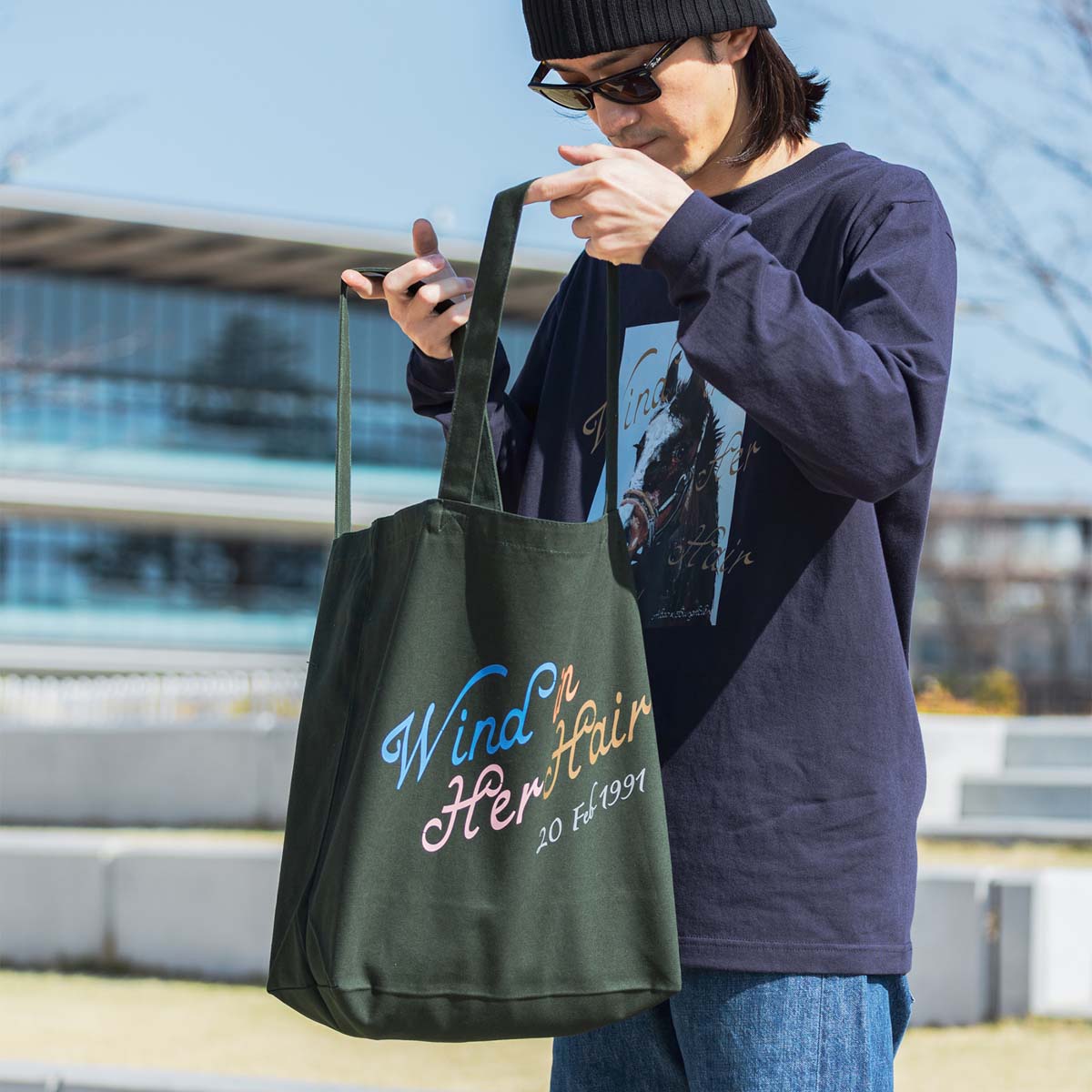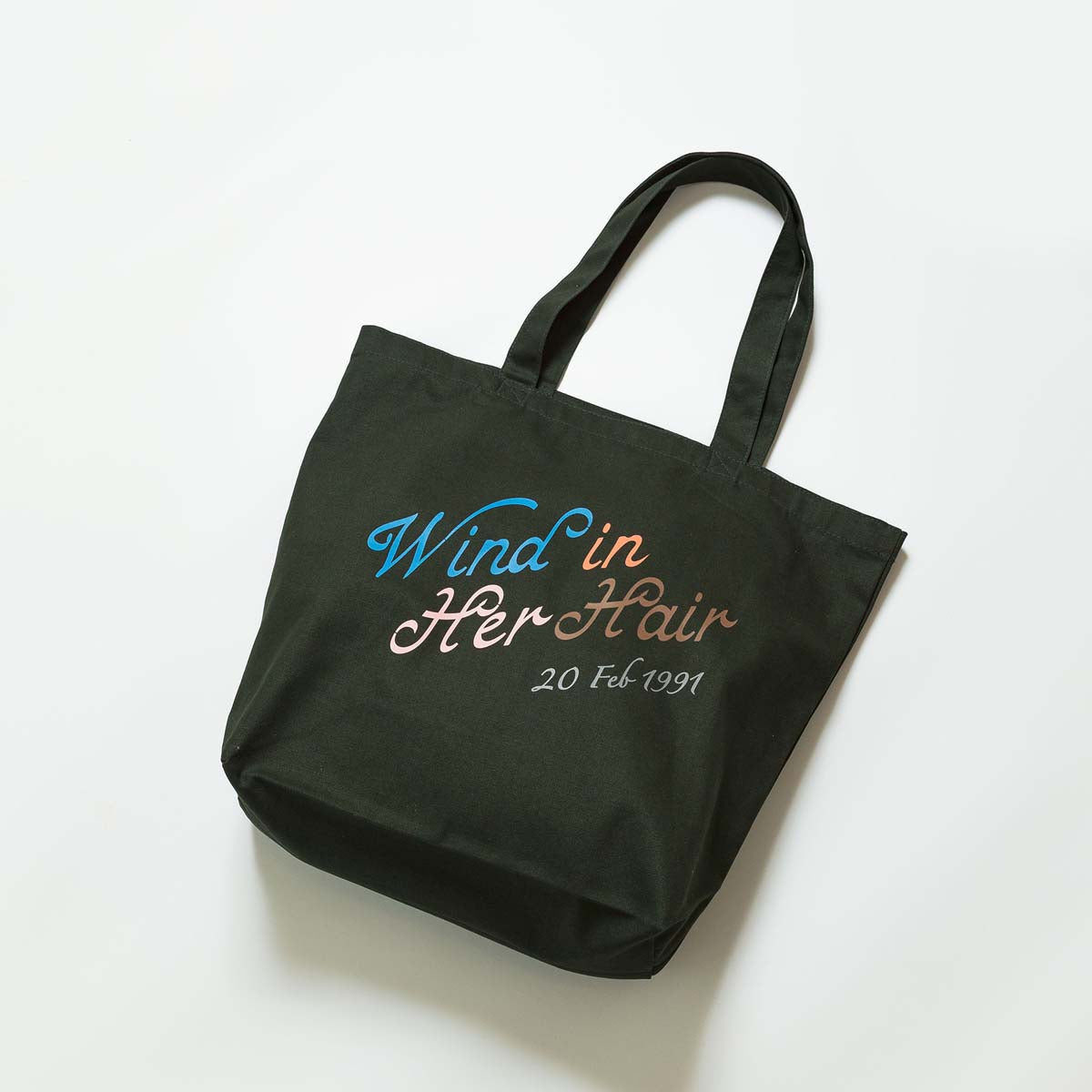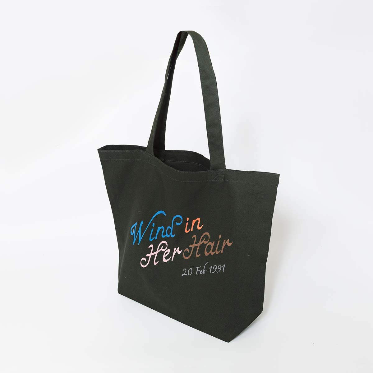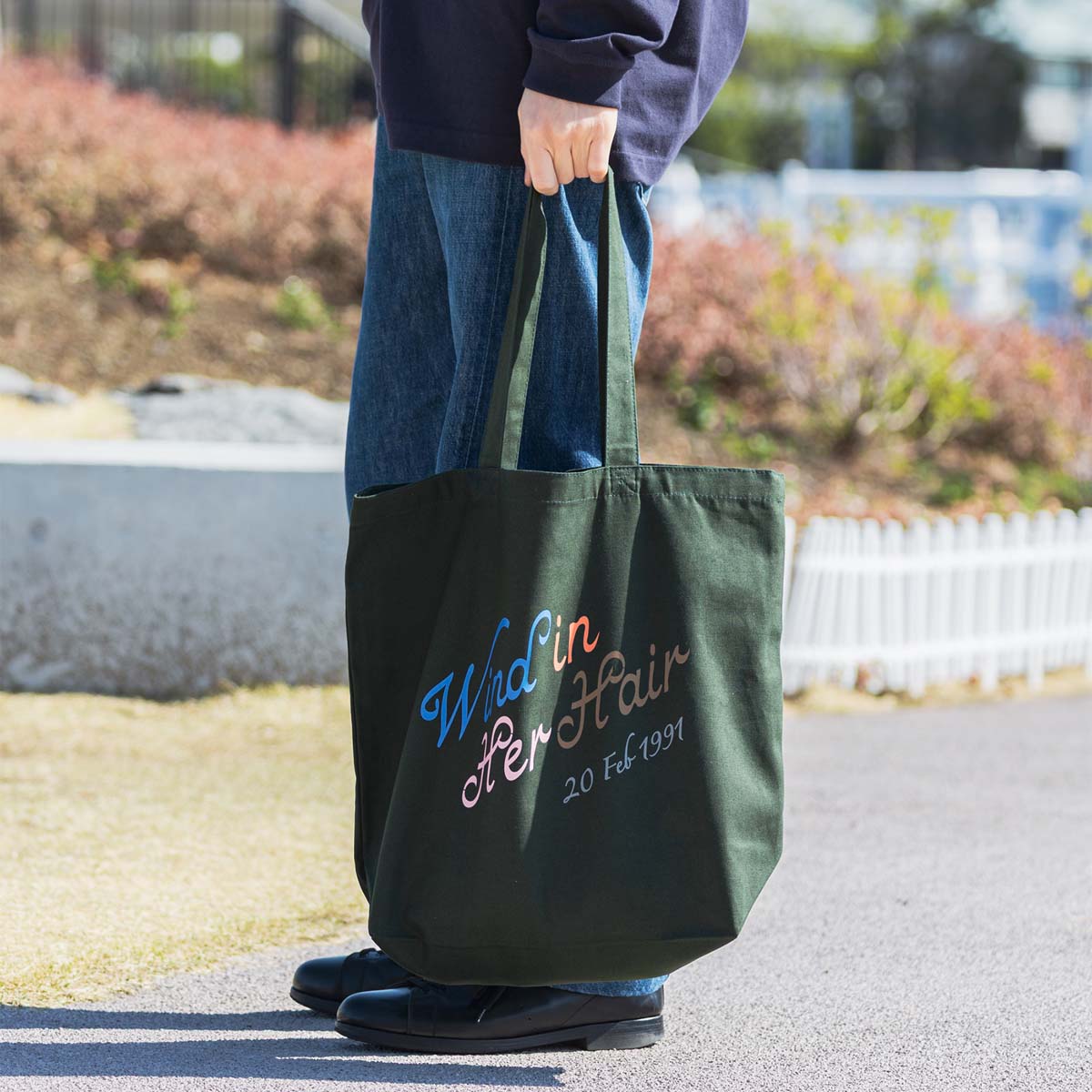 表面にウインドインハーヘアのロゴと生年月日をカラフルにデザイン。落ち着いたボディカラーに映える色使いが存在感を演出します。日常使いしやすく、偉大な母の名をさりげなく取り入れたトートバッグです。