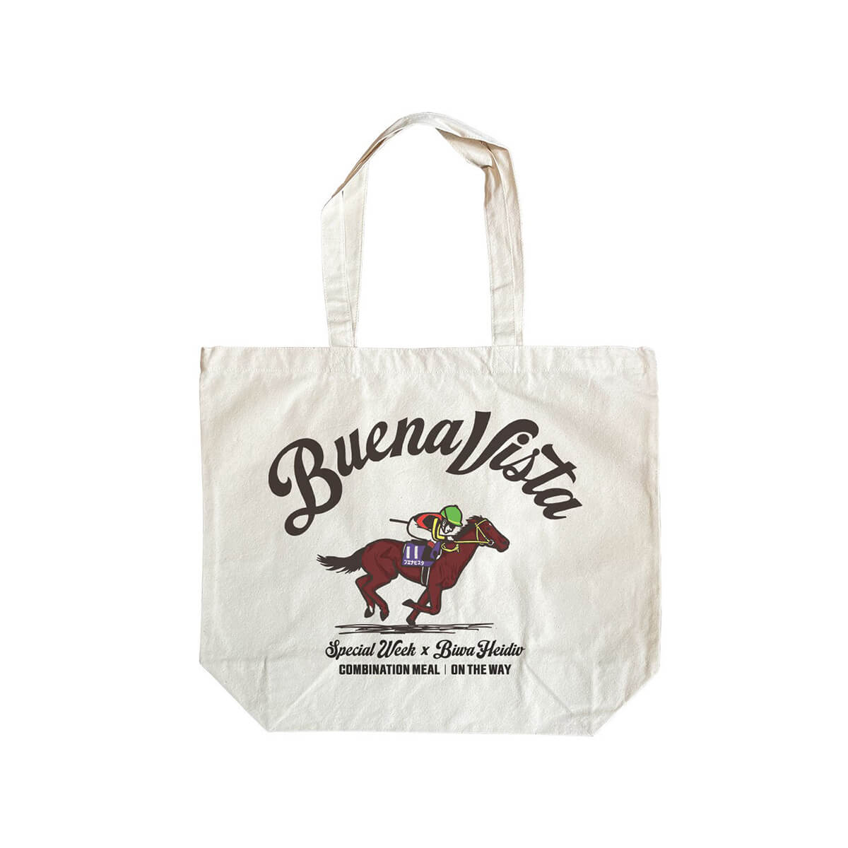 イラストレーター「コウシュウマサル」さんが描く、コンビネーションミール競走馬コレクション第1弾のブエナビスタコラボレーショントートバッグです。