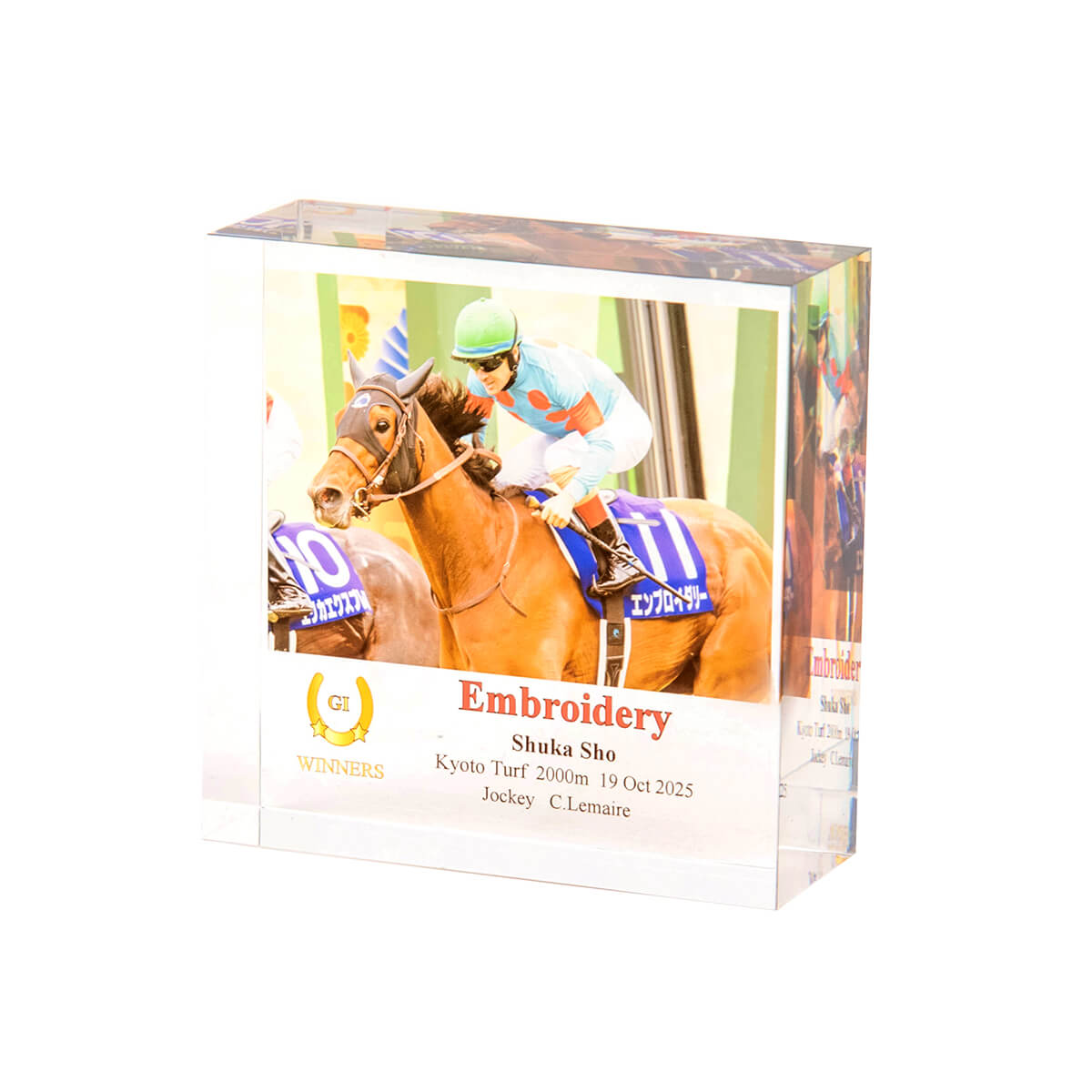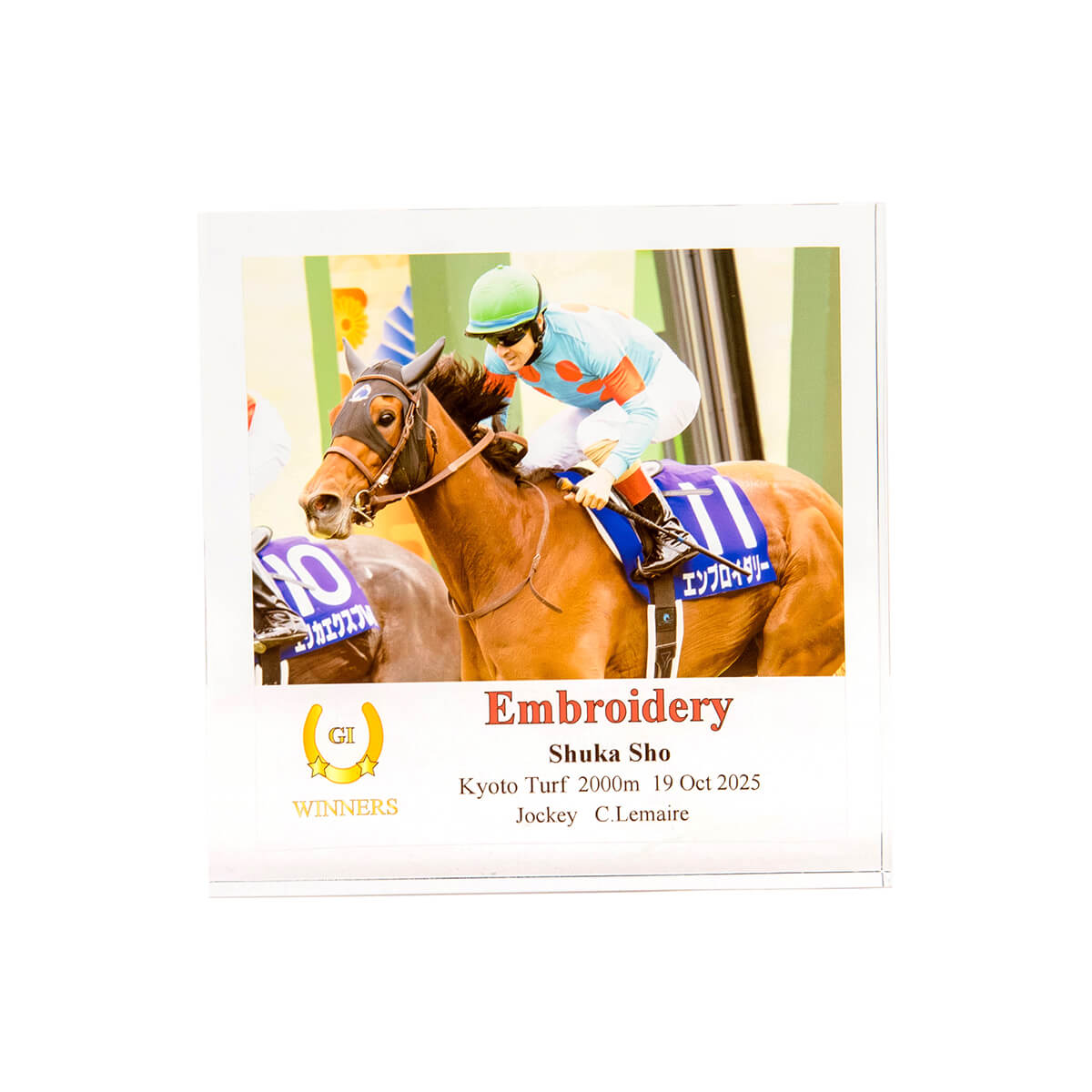 2025年秋華賞優勝馬エンブロイダリーのアクリルオブジェ。