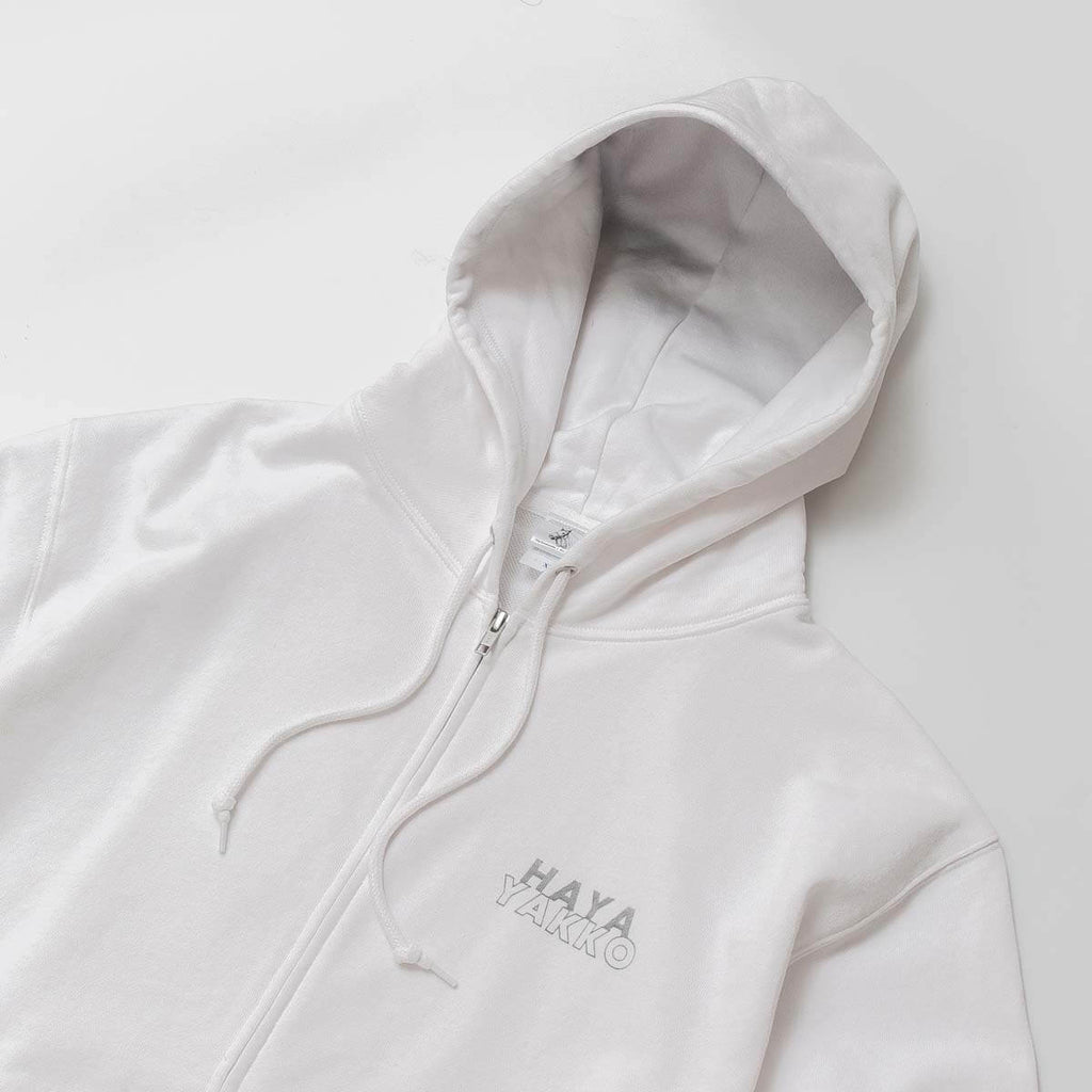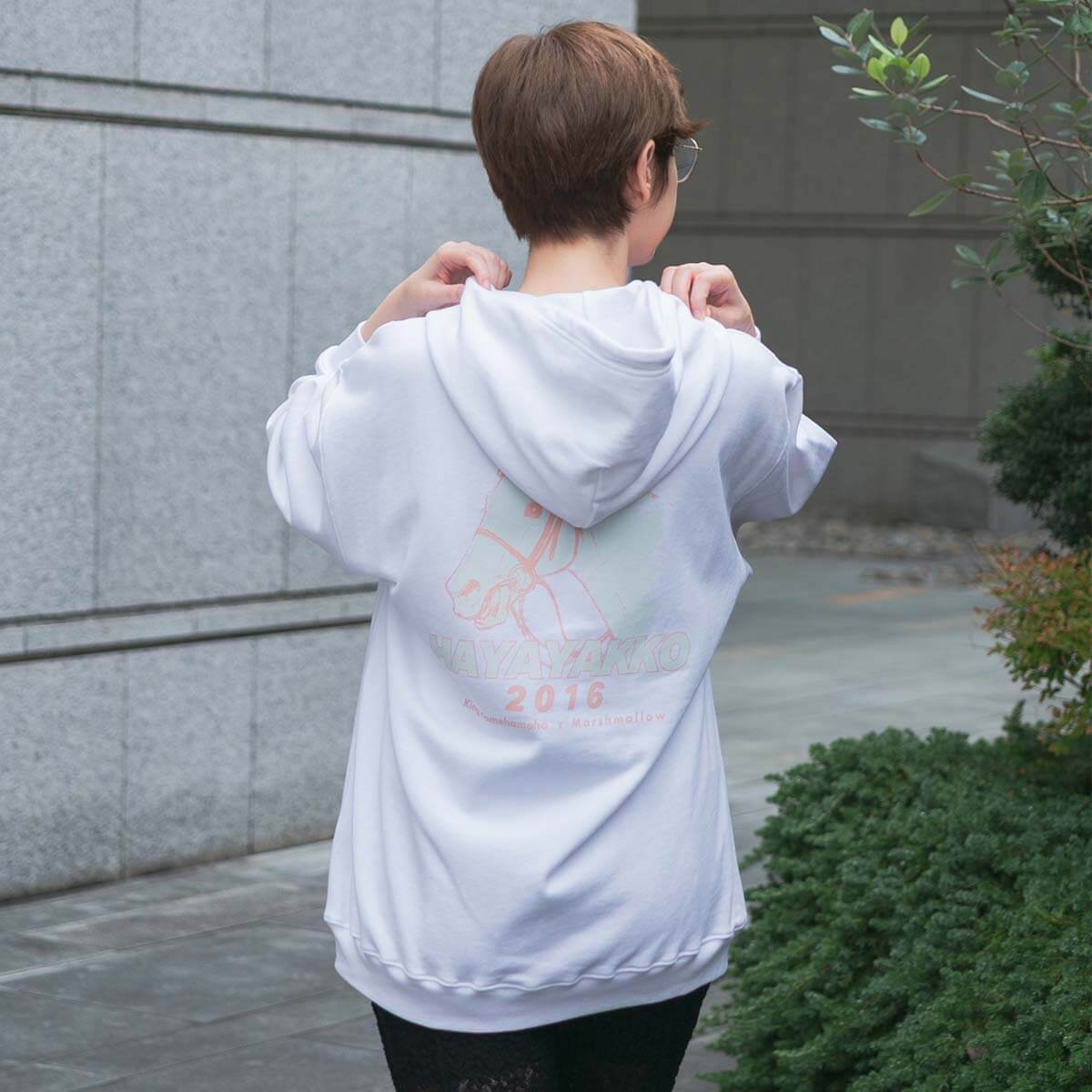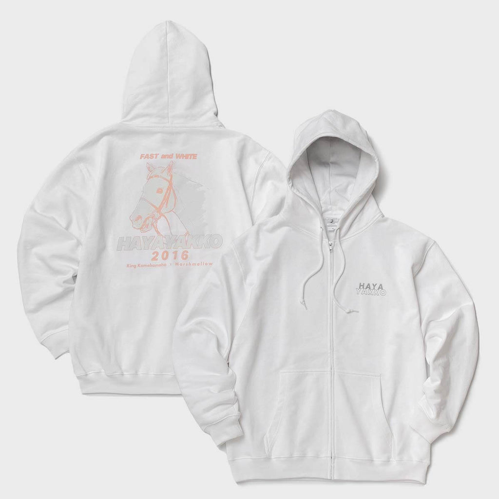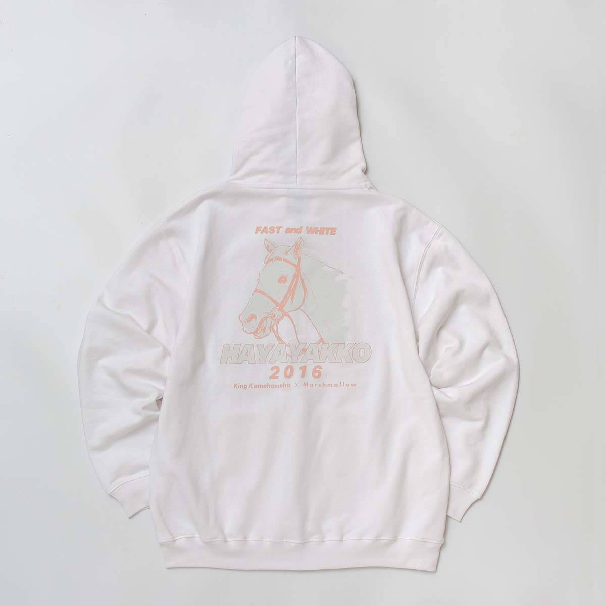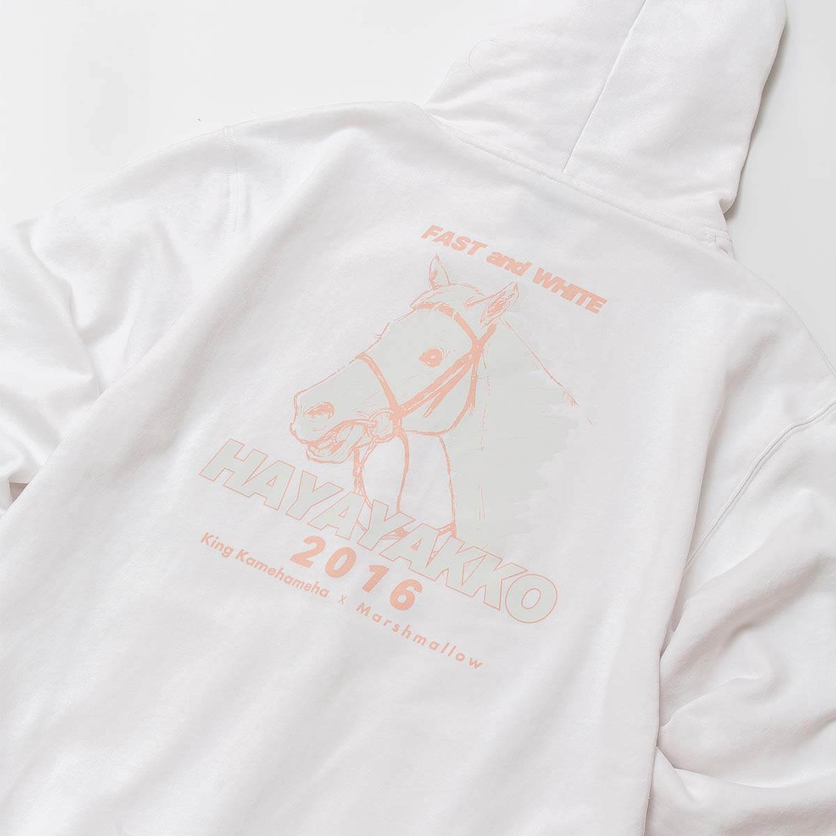 再入荷お知らせ登録 商品についてのお問い合わせ表面は左胸に馬名ロゴを配置。裏面は馬体グラフィックと血統をデザインした、ハヤヤッコのパーカーです。